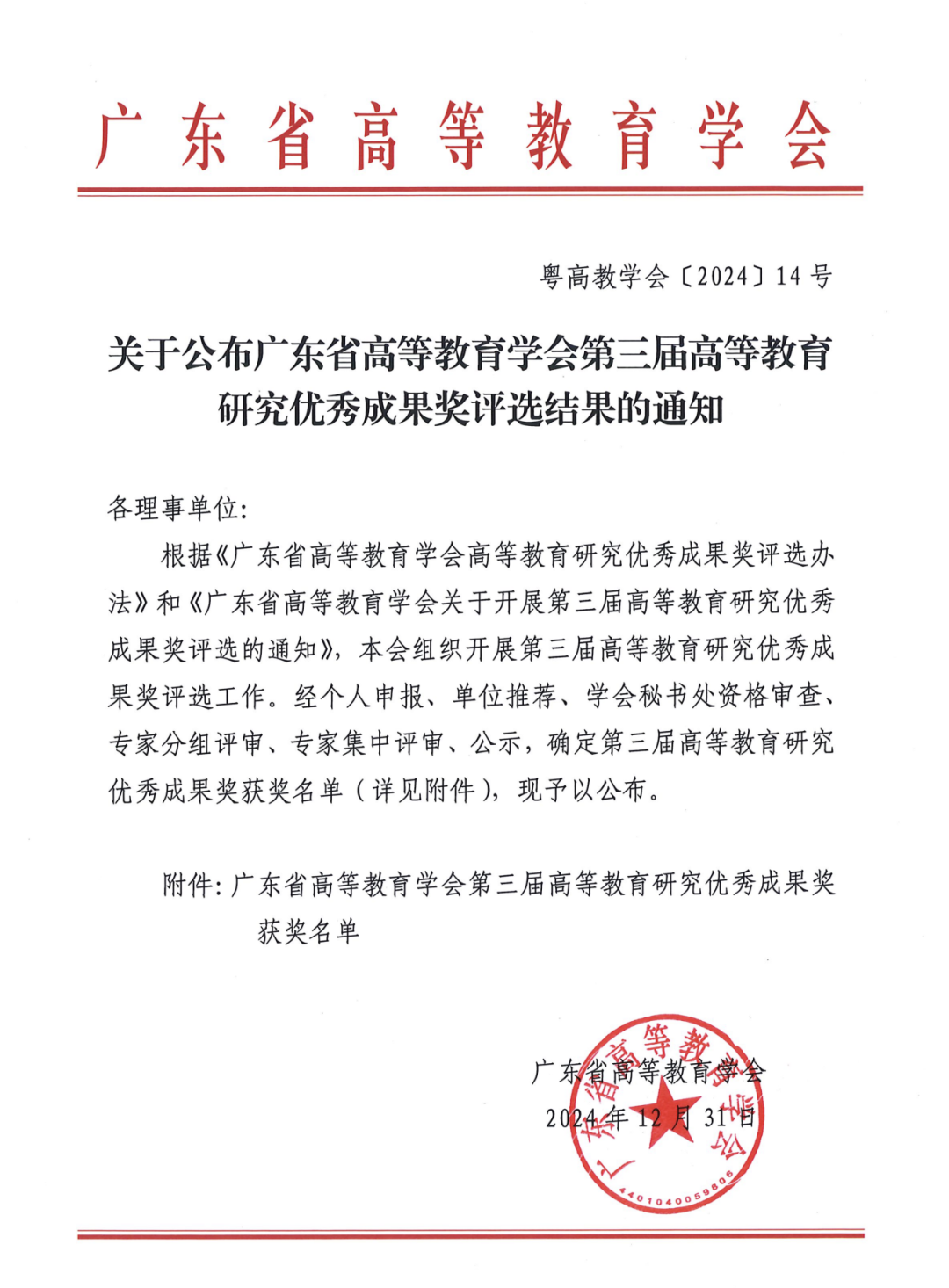 本次高等教育研究优秀成果奖旨在繁荣发展广东省高等教育研究,激发高等教育工作者推进高等教育理论与实践研究的积极性、主动性和创造性,提升高等教育研究质量和水平。本次获奖是公司长期以来一直鼓励和重视广大教师和科研人员勇于创新、产出高水平科研成果的结果。成果为其他高校提供了可借鉴的优秀范例。