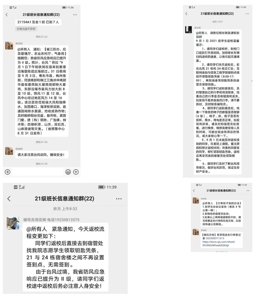 由于本次返校日期与台风“苏拉”登陆时间较接近,部分同学受台风影响无法按时返校。学院领导和21级辅导员们提前统计好不能正常返校的员工名单,做好安抚和关注工作,同时提醒其他同学返校途中注意安全。