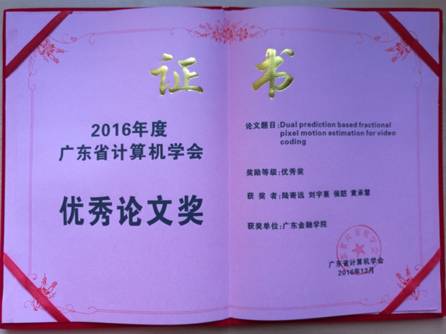 2016年12月7日,广东省计算机学会公布了2016年度优秀论文评选结果,经过申报、推荐及专家组综合评审等环节,评选出4篇一等奖论文,6篇二等奖论文,9篇三等奖论文以及7篇优秀奖论文。3044永利集团3044永利集团陆寄远、刘宇熹、侯昉和黄承慧四位老师合作发表的论文“Dual prediction based fractional pixel motion estimation for video coding”获优秀奖。