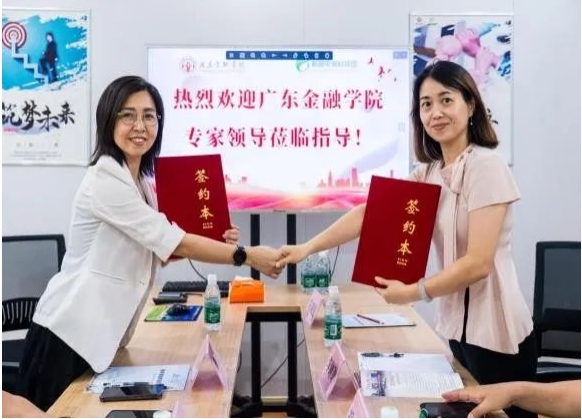 随后,一行人来到中山市格林电商科技园,就共建校企合作事宜进行交流,参观了园区核心区与入驻商户,科技园总经理陈燕介绍了园区“电商集聚地+生活配套服务”双轮驱动的产业特色,以及近年来孵化创新团队的成功经验,带领我们实地走访了园区内的电商企业,了解目前电商行业资讯及走势,新媒体与电商如何结合应用等。在交流过程中,计算机公司党委副书记李琳琳表示,一直以来学院积极推动教学与实践深度融合,希望能与格林电商科技园在人才培养、科研实践、实习就业等方面开展多层次、多领域合作。交流会上,双方签署了校企党建实习就业共建协议,将“学用结合、产教融合”推向新高度,未来双方将围绕“金融+电商+科技”的交叉融合,持续深化合作,共同培养更多符合时代需求的复合型人